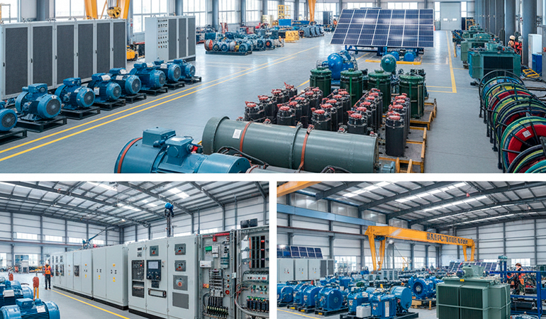 Motores, variadores de frecuencia, bancos de capacitores, CCM, componentes electronicos y de control, paneles solares, cargadores, transformadores, conductores especificos.